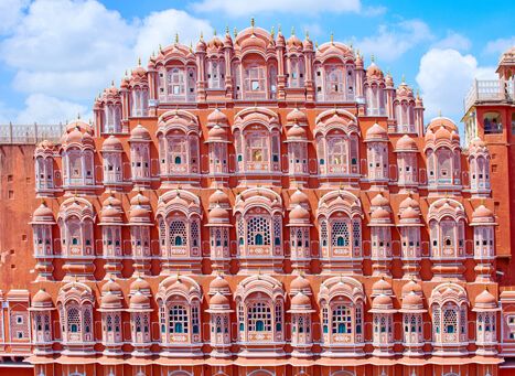 Hawa Mahal, also known as Palace of the Breeze was built in 1799 AD by Maharaja Sawai Pratap Singh and designed by Lal Chand Ustad in the form of the crown of Krishna. Its unique five-storied exterior is also akin to the honeycomb of the beehive with its 953 small windows called jharokhas. The original intention of the lattice was to allow royal ladies to observe everyday life in the street below without being seen. Built of red and pink sandstone, the palace is situated in the heart of Jaipur. It is a part of the City Palace and extends to the women's chambers. It particularly looks outstanding when viewed early in the morning, lit with the golden light of sunrise.